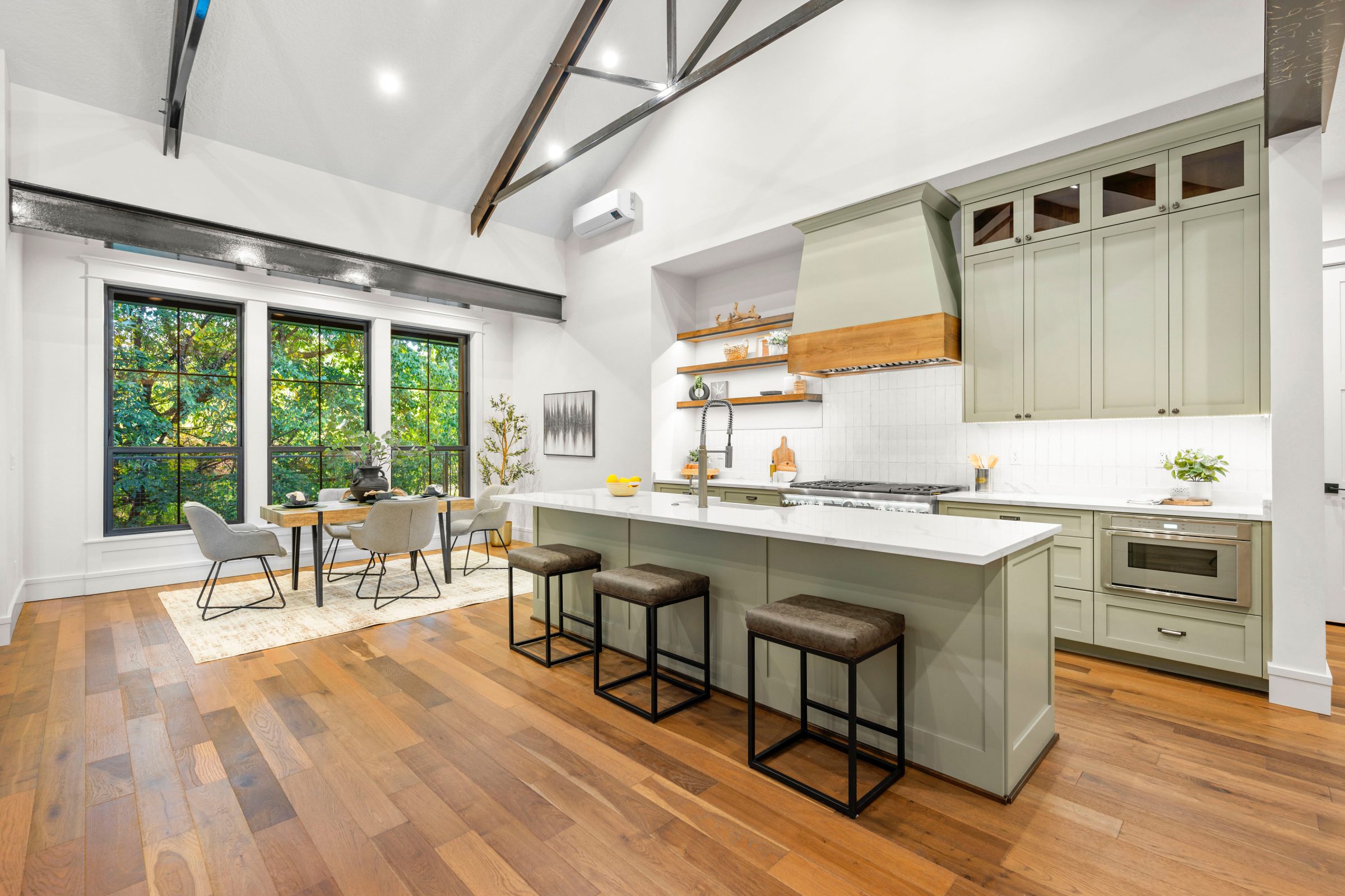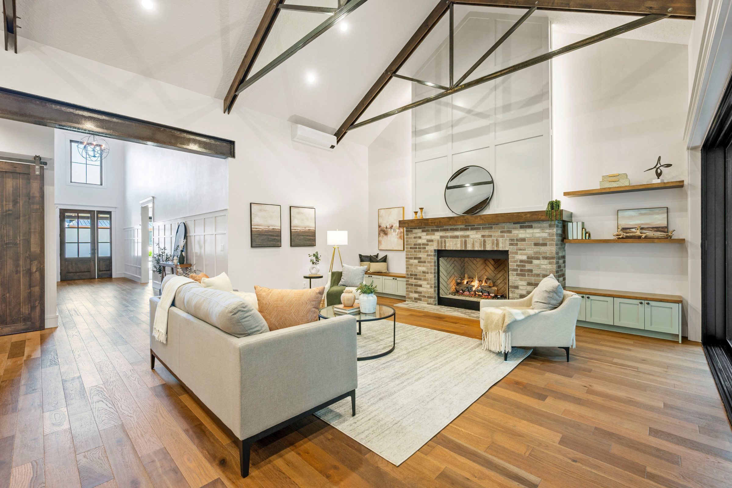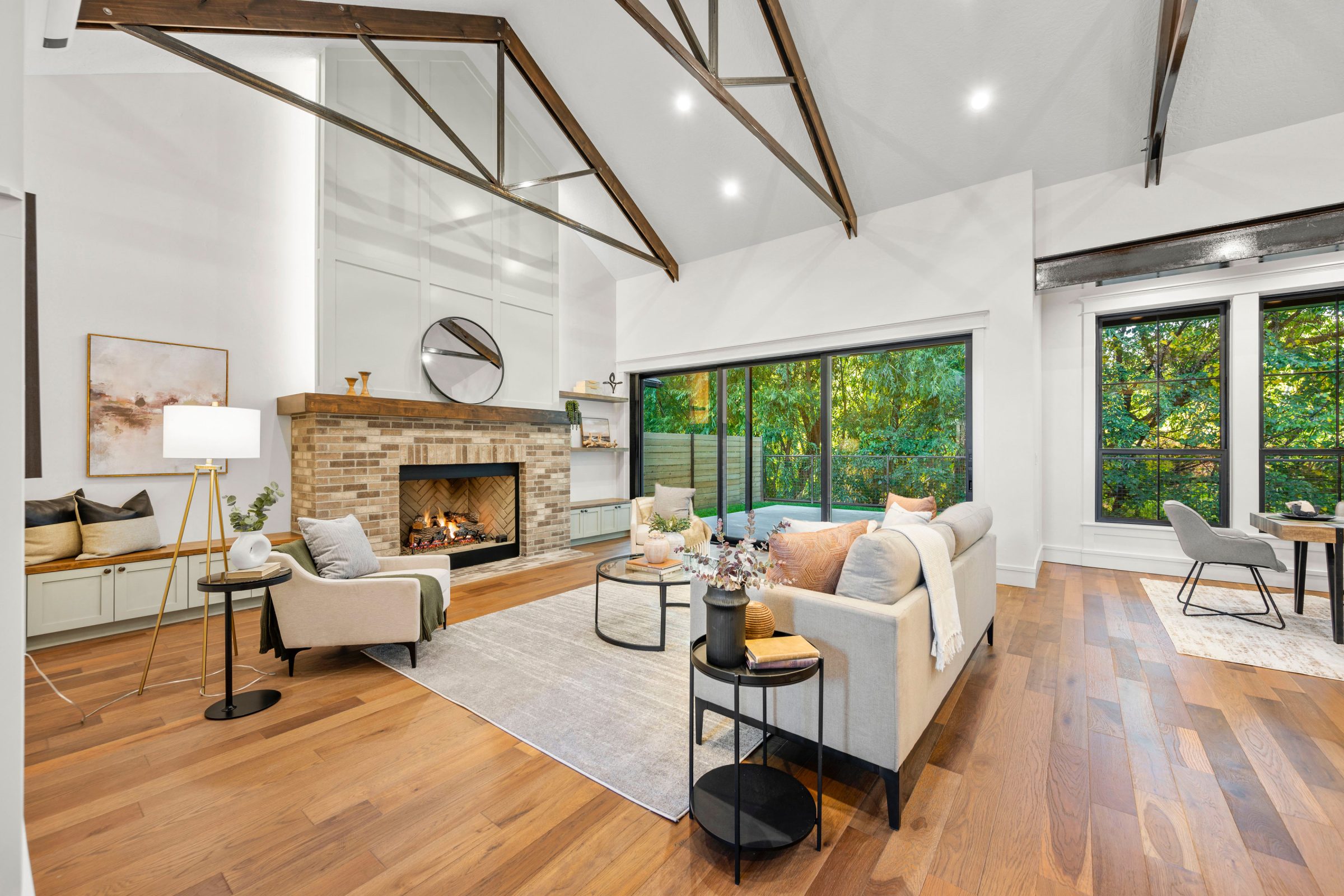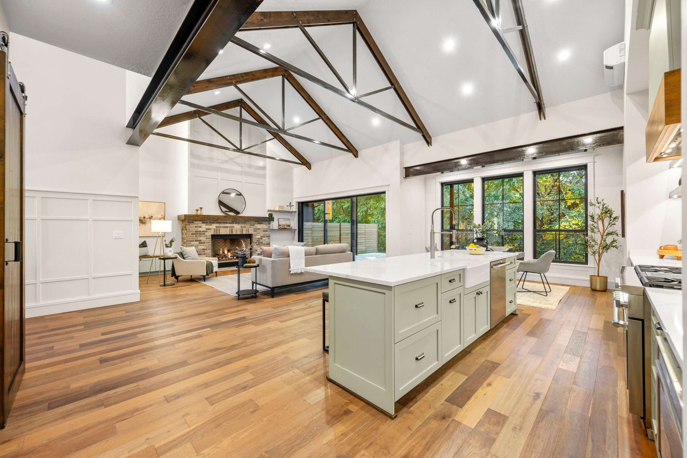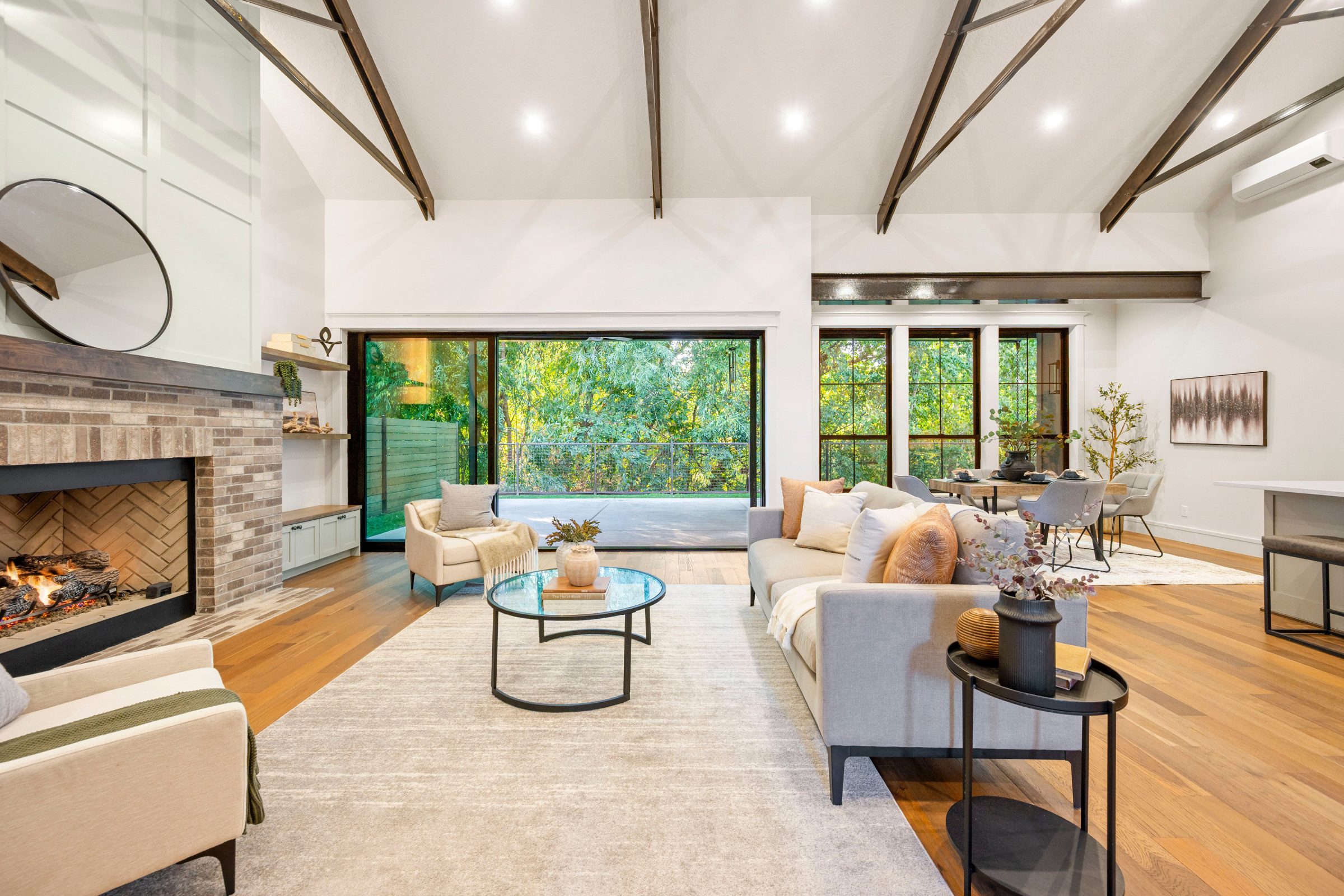 The home features soaring ceilings with exposed steel beams, radiant heated hardwood floors, and architectural details throughout that create an atmosphere of understated luxury. The open-concept main living area centers around an oversized gas fireplace with custom built-ins and 12-foot triple sliding doors that connect seamlessly to the covered back patio—perfect for year-round indoor-outdoor living. The kitchen showcases quartz countertops, a custom hood, 6-burner Thermador cooktop, double ovens, full-size Electrolux refrigerator, and a walk-in pantry with quartz counters and an oversized barn door.