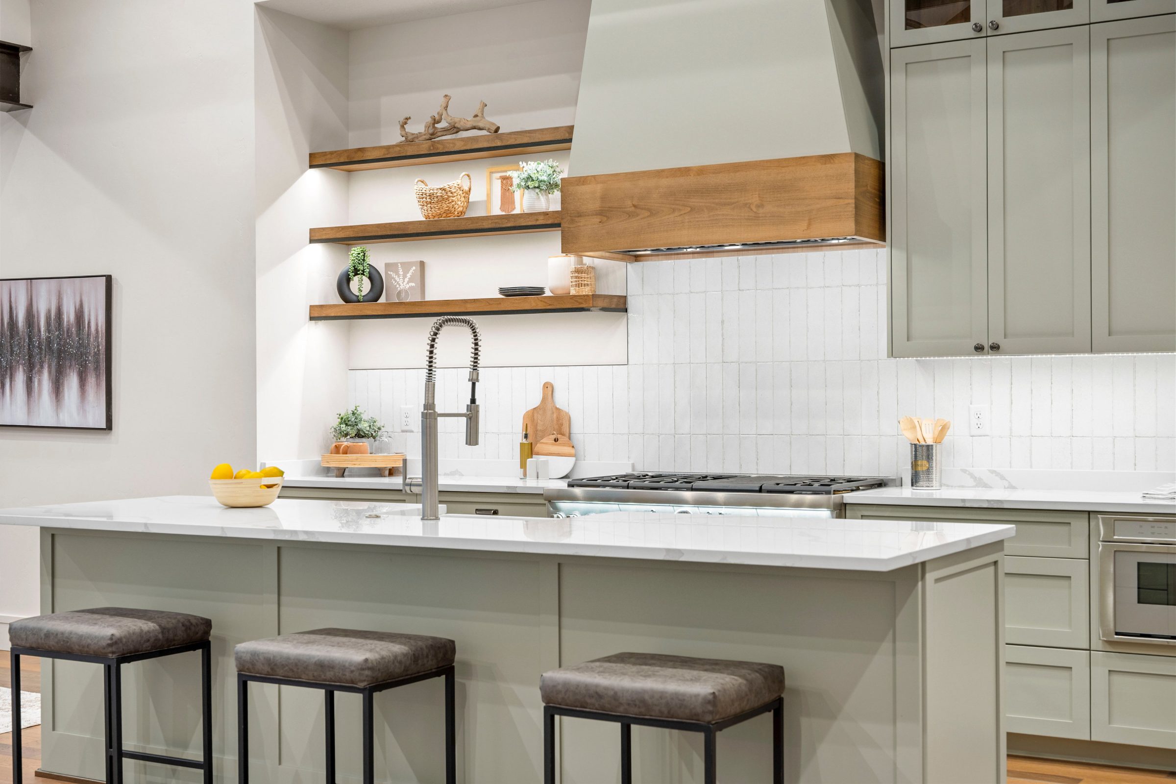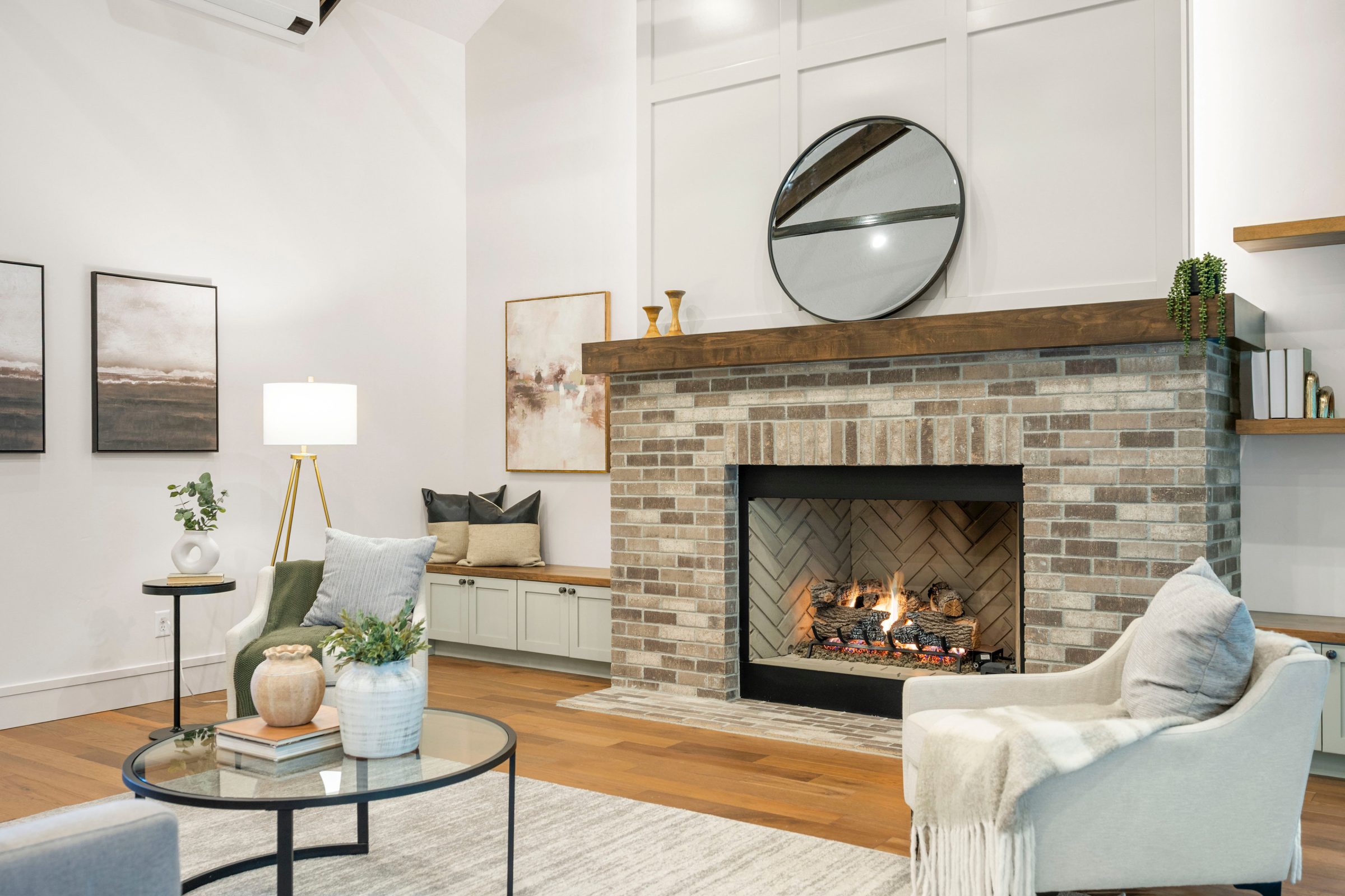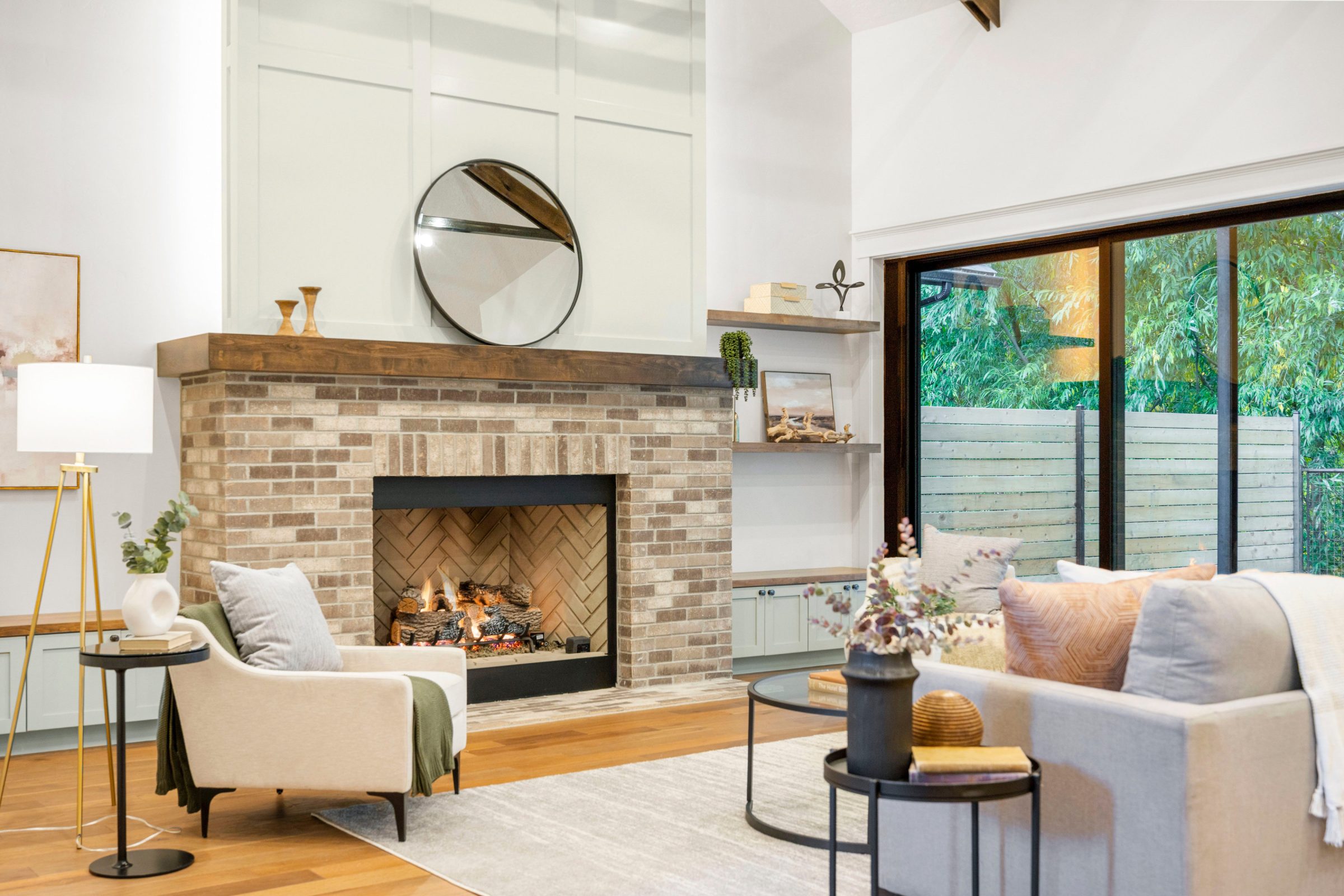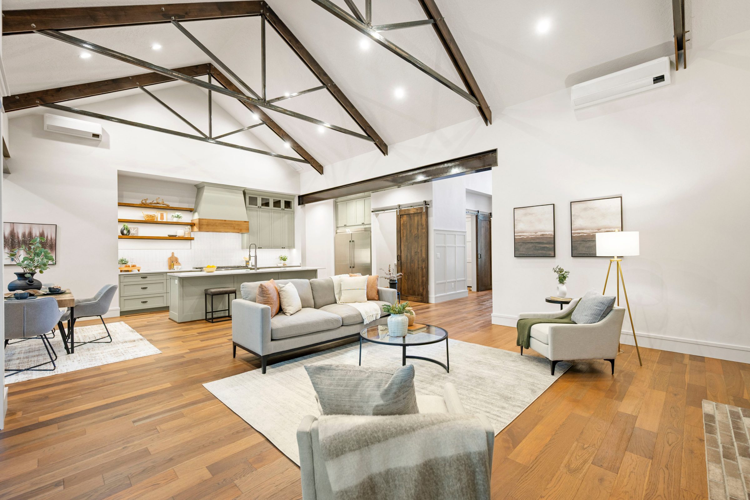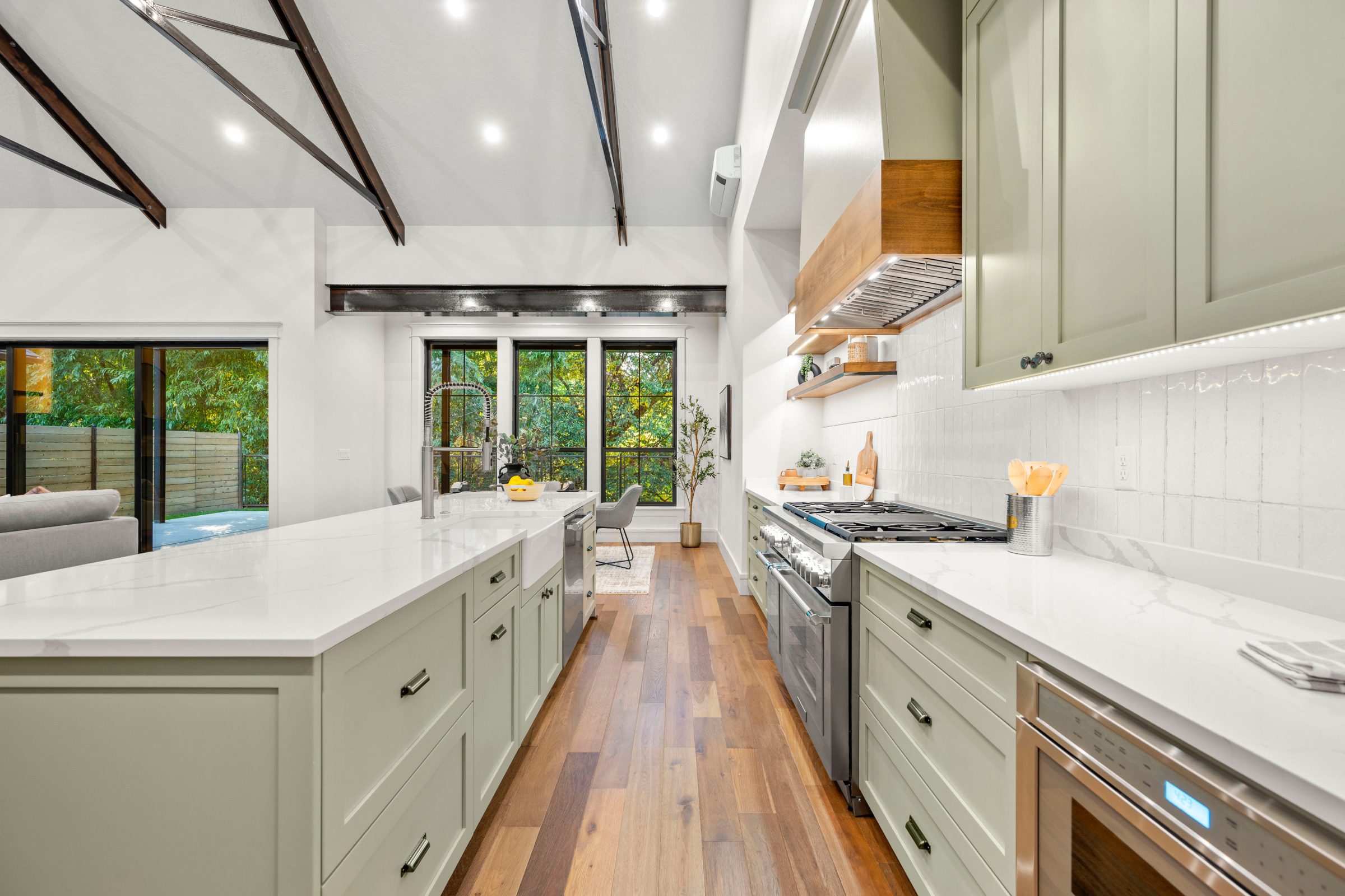 The home features soaring ceilings with exposed steel beams, radiant heated hardwood floors, and architectural details throughout that create an atmosphere of understated luxury. The open-concept main living area centers around an oversized gas fireplace with custom built-ins and 12-foot triple sliding doors that connect seamlessly to the covered back patio—perfect for year-round indoor-outdoor living. The kitchen showcases quartz countertops, a custom hood, 6-burner Thermador cooktop, double ovens, full-size Electrolux refrigerator, and a walk-in pantry with quartz counters and an oversized barn door.