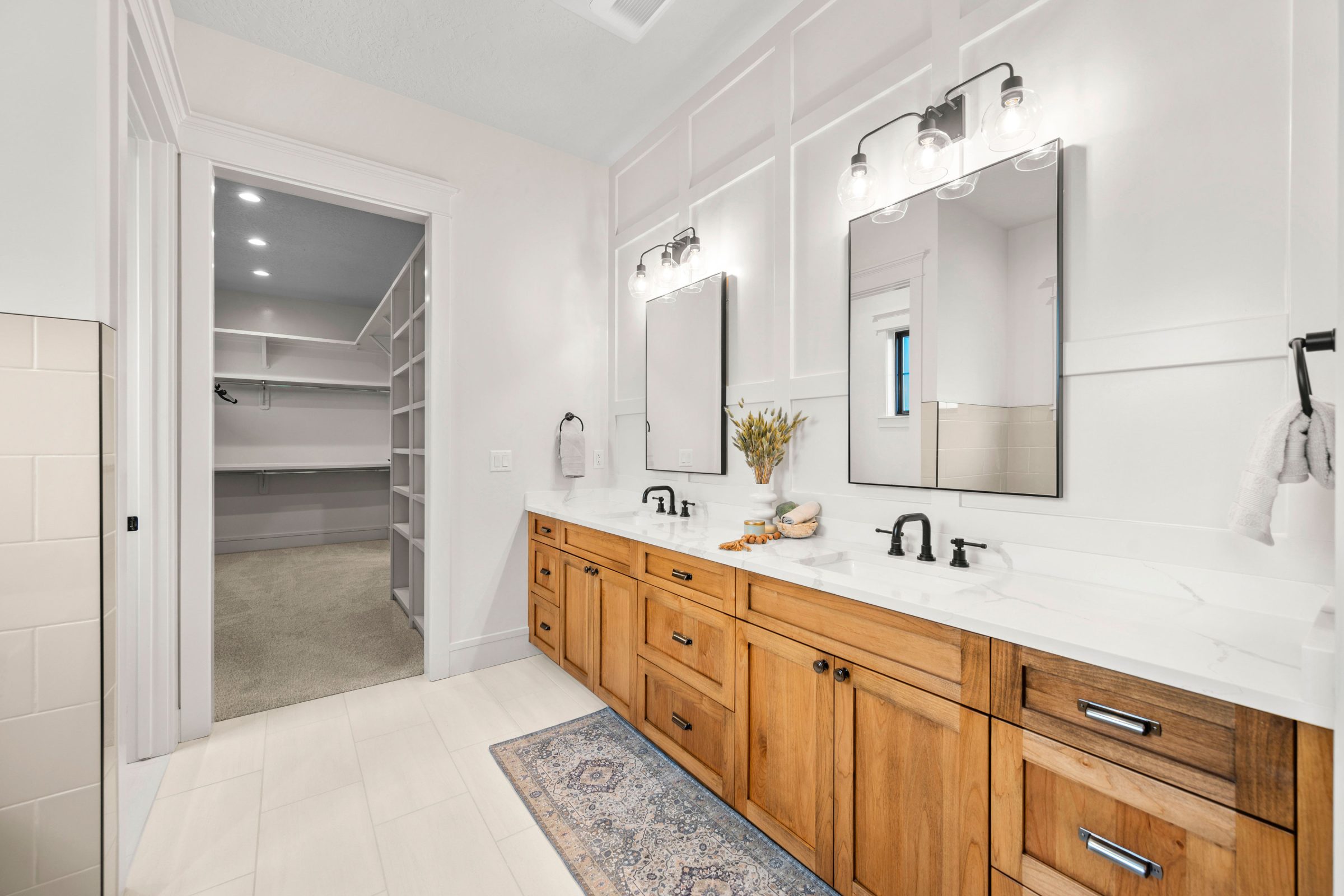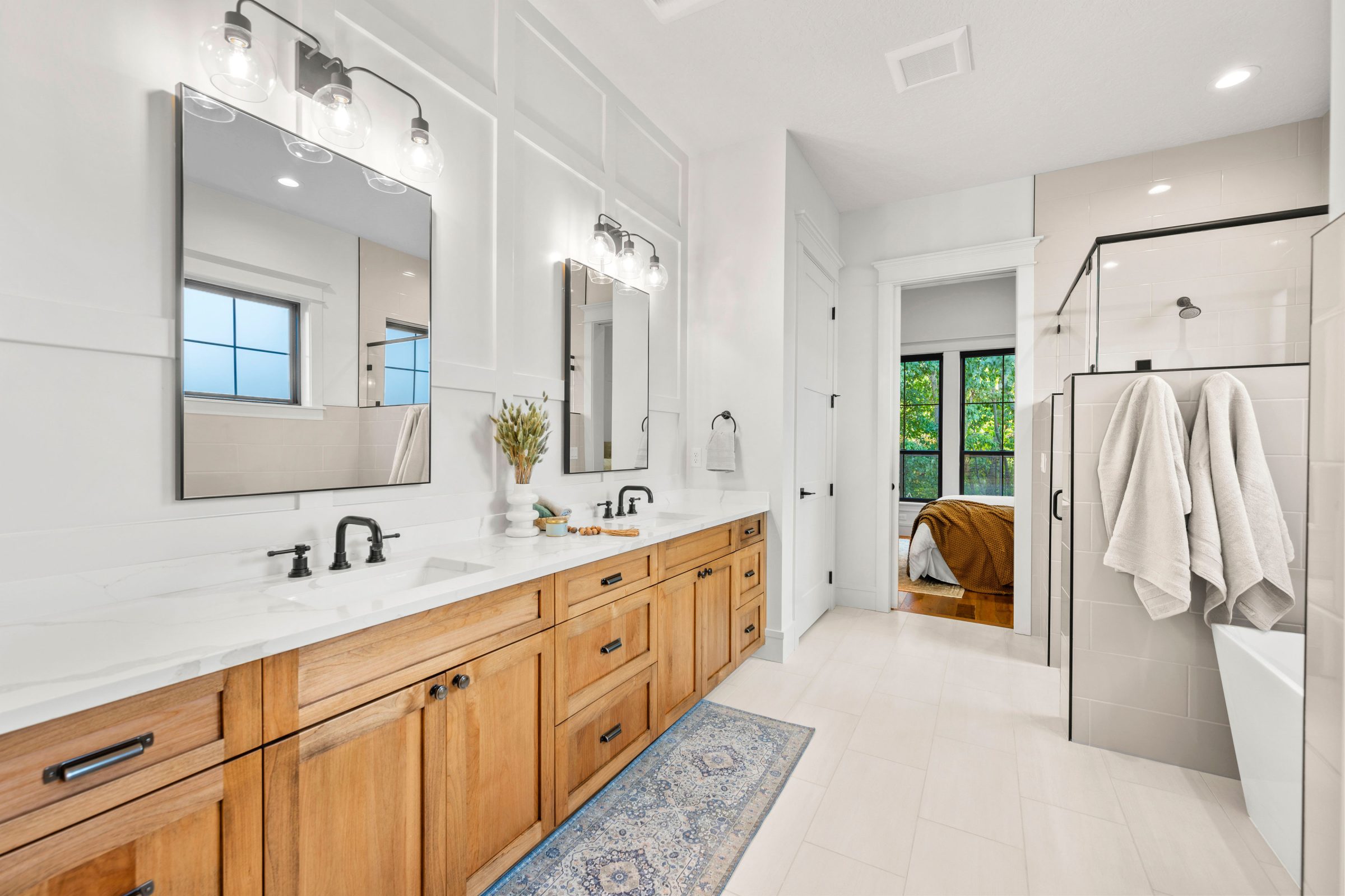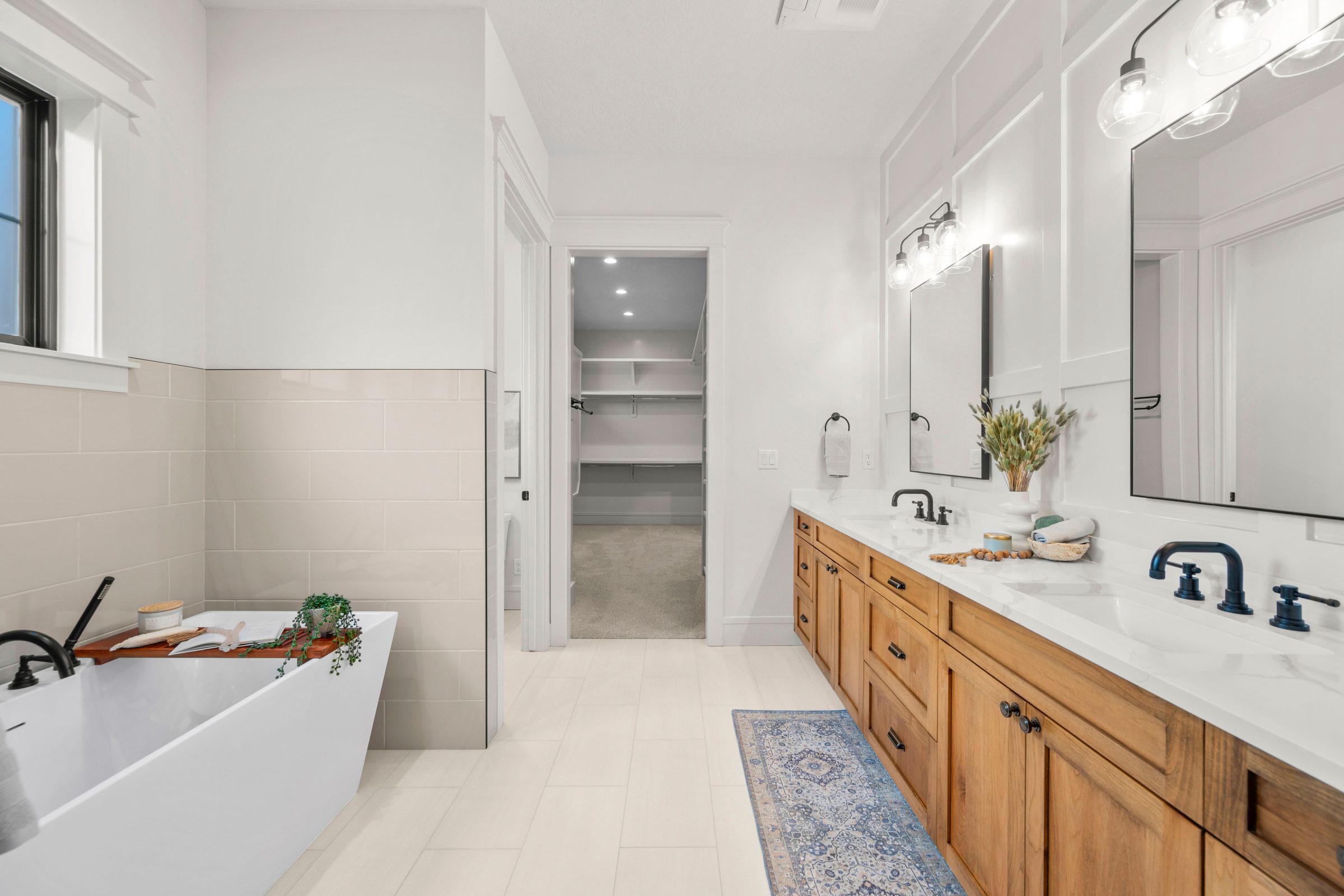 The vaulted primary suite offers a peaceful retreat with electronic blinds, a spa-like bath featuring a soaking tub, tiled shower, dual quartz vanities, and a walk-in closet that links directly to the laundry and mudroom. Two additional bedrooms, a beautifully finished guest bath, and a three-car garage with polycoated flooring complete the home’s thoughtful design.