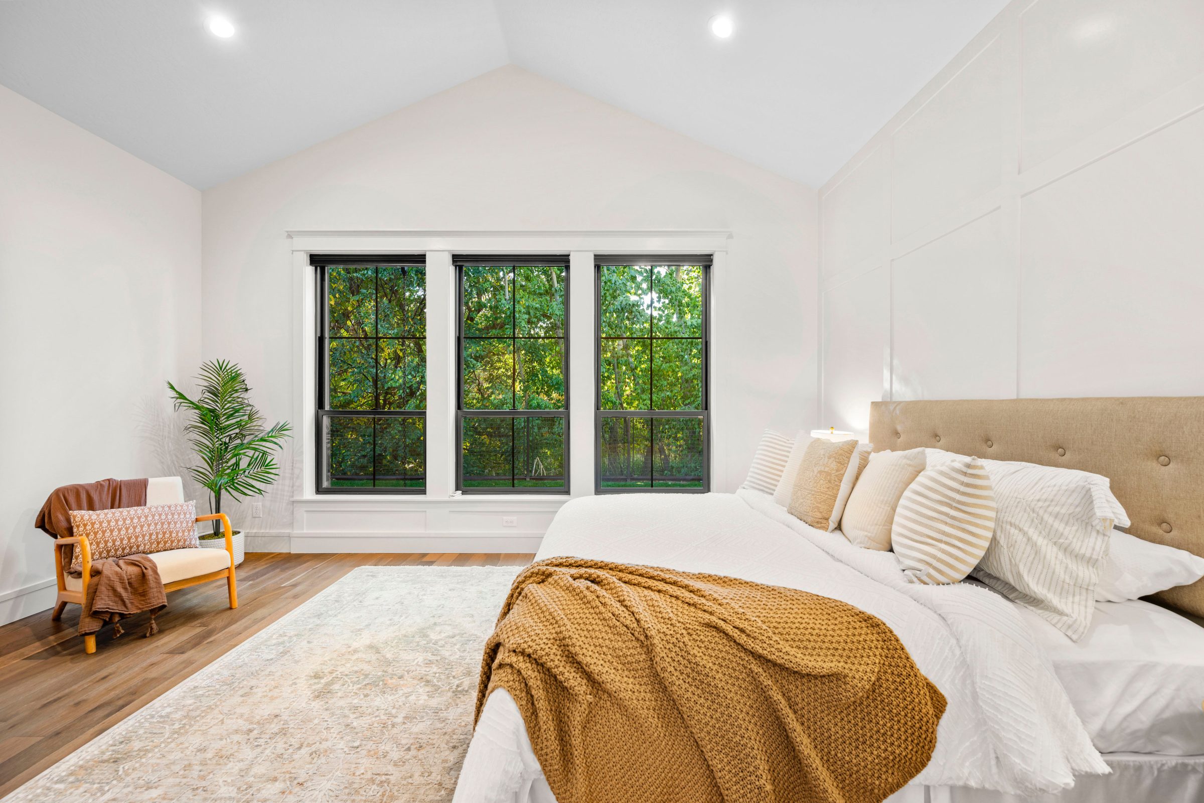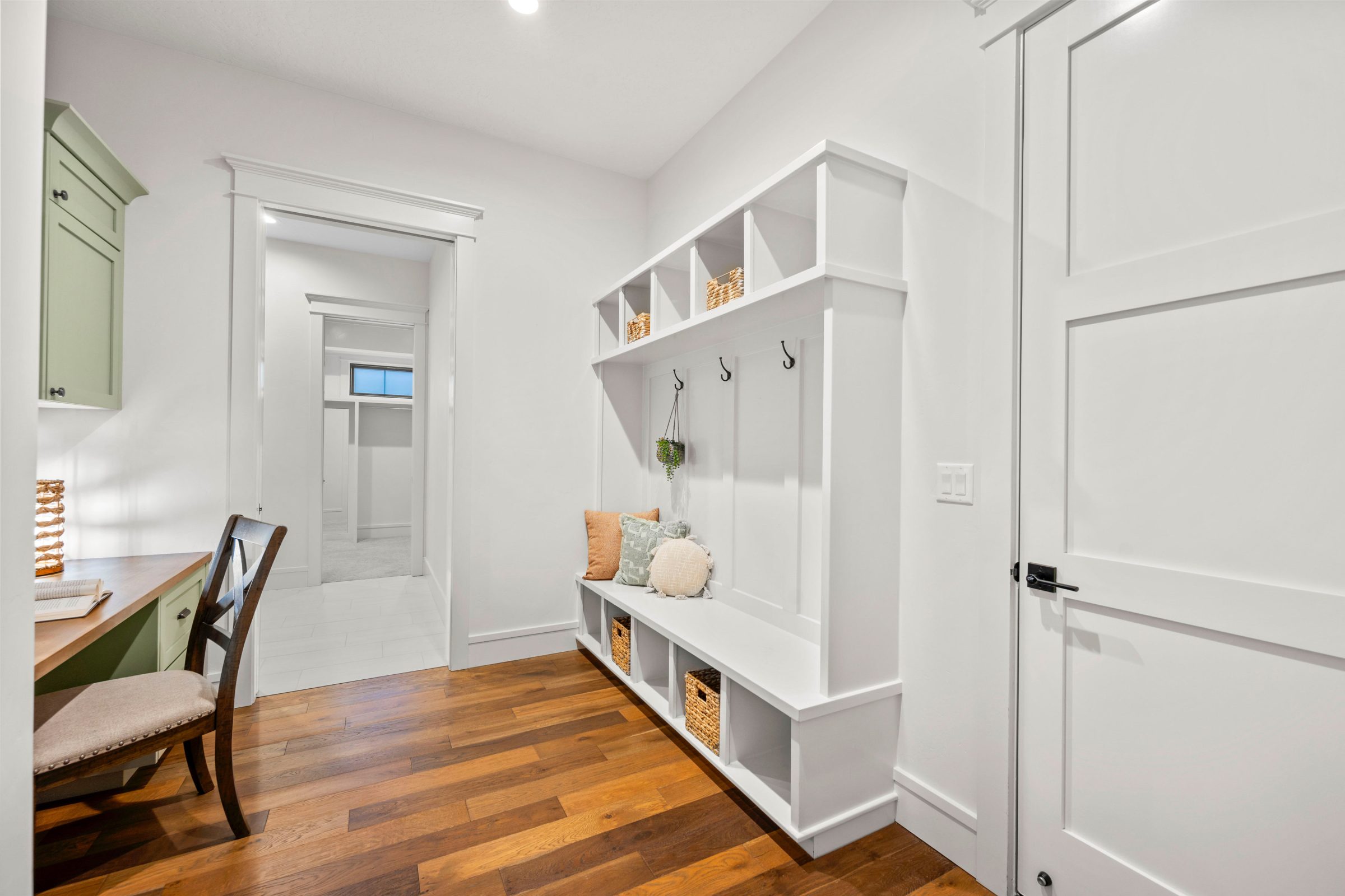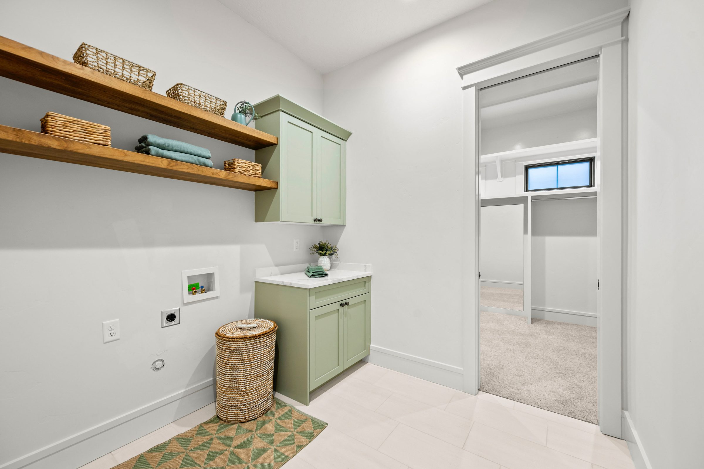 The vaulted primary suite offers a peaceful retreat with electronic blinds, a spa-like bath featuring a soaking tub, tiled shower, dual quartz vanities, and a walk-in closet that links directly to the laundry and mudroom. Two additional bedrooms, a beautifully finished guest bath, and a three-car garage with polycoated flooring complete the home’s thoughtful design.